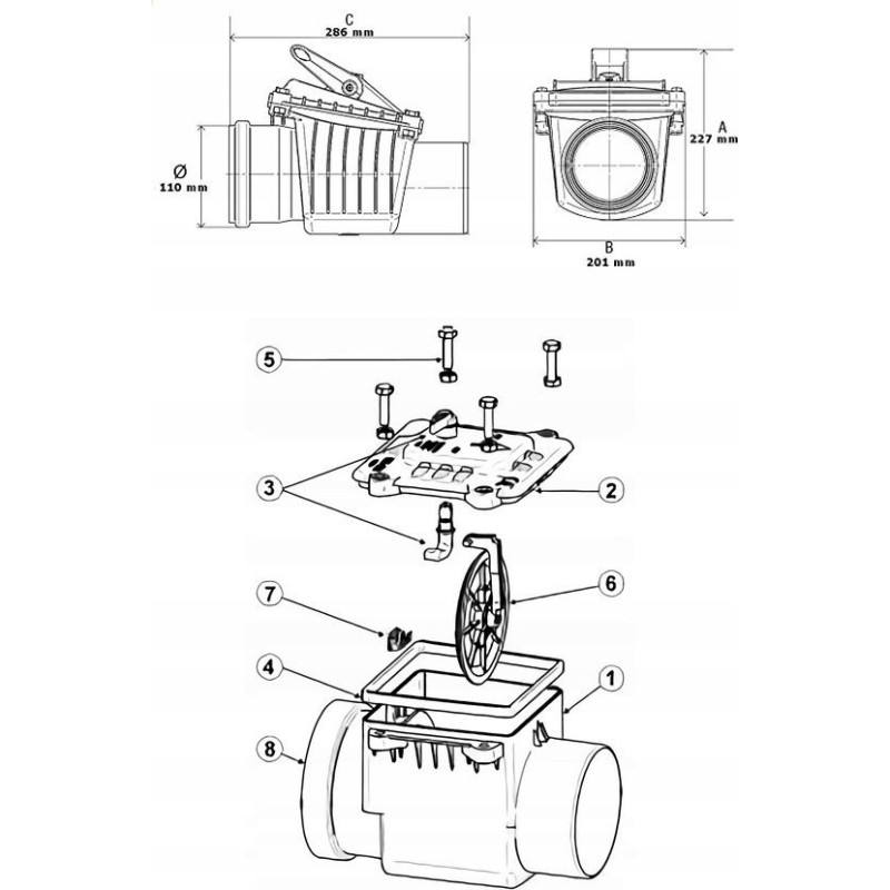 Zastosowanie: zręczna klapa burzowa przeznaczona do zamontowania na poziomych odcinkach kanalizacji, w studzienkach kanalizacyjnych wewnątrz lub na zewnątrz budynków. Zręczne klapy burzowe działają samoczynnie, umożliwiając ciągły i swobodny odpływ ścieków zgodnie ze spadkiem rury kanalizacyjnej wody deszczowej.