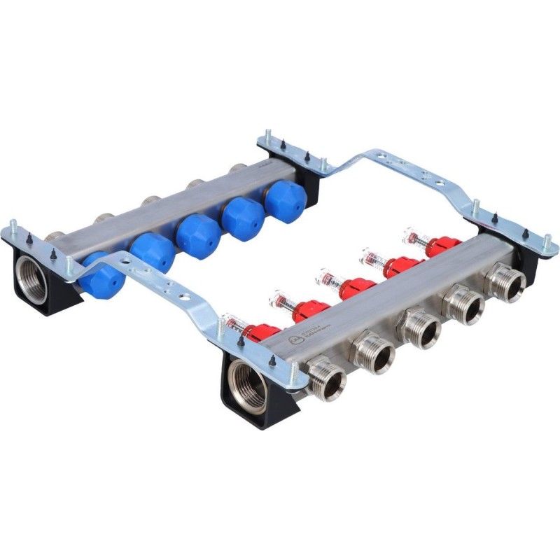 Rozdzielacz składa się z dwóch belek wykonanych ze stali nierdzewnej o profilu 1" z gwintami wewnątrznymi. Odległość między belkami wynosi 235 mm. Wyjścia na obwody grzewcze wyposażone są w gwinty zewnętrzne 3/4" oraz zawory do siłowników z przepływomierzami. Belki posiadają zaślepki 1" z jednej strony, a istnieje również możliwość obrócenia belek o 180°.