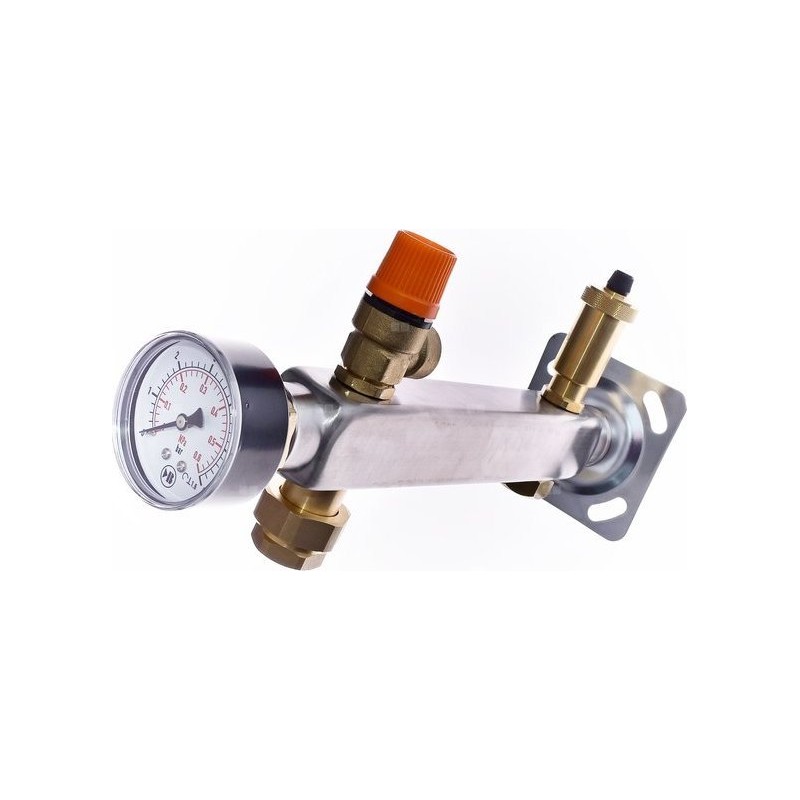 SpecyfikacjaGrupa bezpieczeństwa składa się z belki INOX, zaworu bezpieczeństwa, manometru tarczowego oraz zaworu zwrotnego z kontrnakrętką, co umożliwia szybkie ustawienie wypływu. Oferuje także odpowietrznik manualny lub automatyczny oraz solidną stalową blachę montażową z otworami typu fasolka.