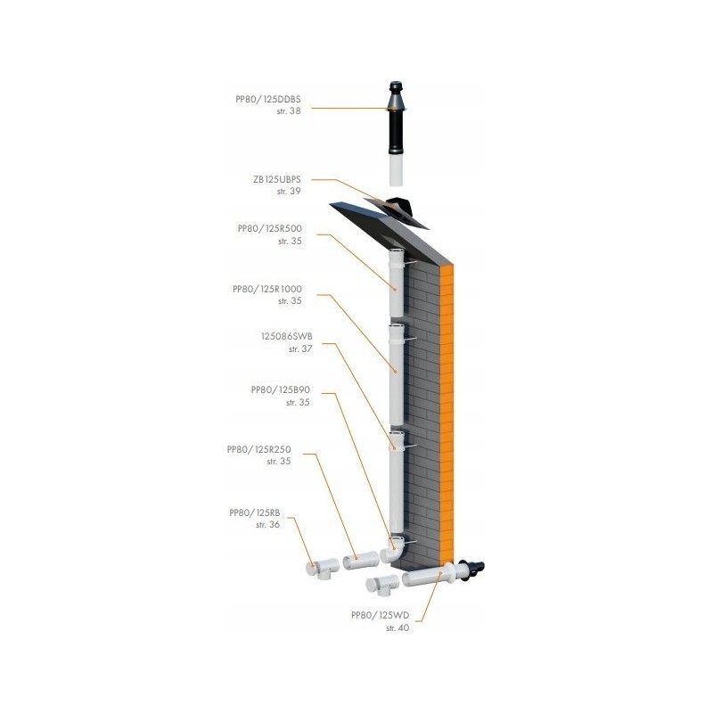 System odprowadzania spalin z tworzywa sztucznego PPs do kotłów kondensacyjnych. Może być używany jako wkład kominowy w połączeniu z systemami jednonurtowymi lub jako samodzielny system.