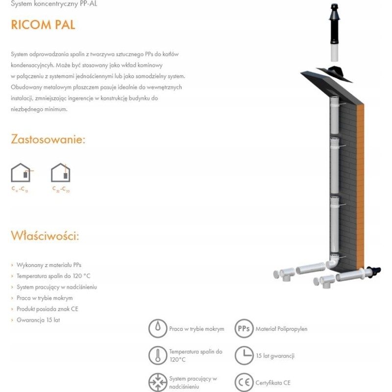 Ricom Pal to zaawansowane systemy odprowadzania spalin z tworzyw sztucznych przeznaczone do kotłów kondensacyjnych. Wewnętrzna rura wykonana z PPs, a zewnętrzna to aluminium, co zapewnia trwałość i odporność na uszkodzenia. Maksymalna temperatura spalin dla tego systemu wynosi 120°C. W skład systemu wchodzi pełna gama rur i złączek potrzebnych do kompletnego przewodu kominowego. Niewielka waga elementów i dokładne wykonanie umożliwiają szybki i efektywny montaż. System RICOM to doskonałe rozwiązanie zarówno do nowych budynków, jak i modernizacji istniejących systemów kominowych. RICOM PAL to podwójnościenne rury do odprowadzania spalin i pobierania powietrza do spalania o średnicach 60/100, 80/125 i 110/160.