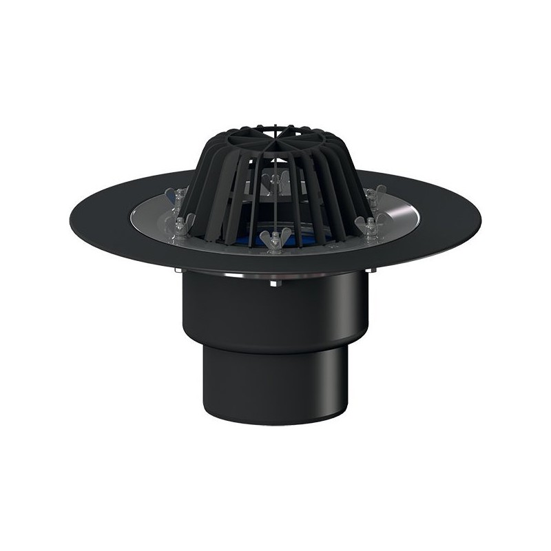 Wpust dachowy grawitacyjny DN110 pionowy z koszem na liście i stalowym pierścieniem skręcanym