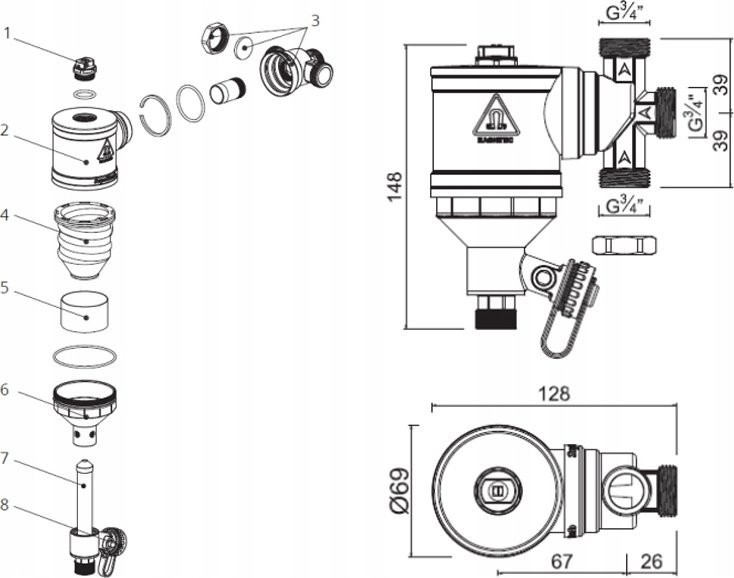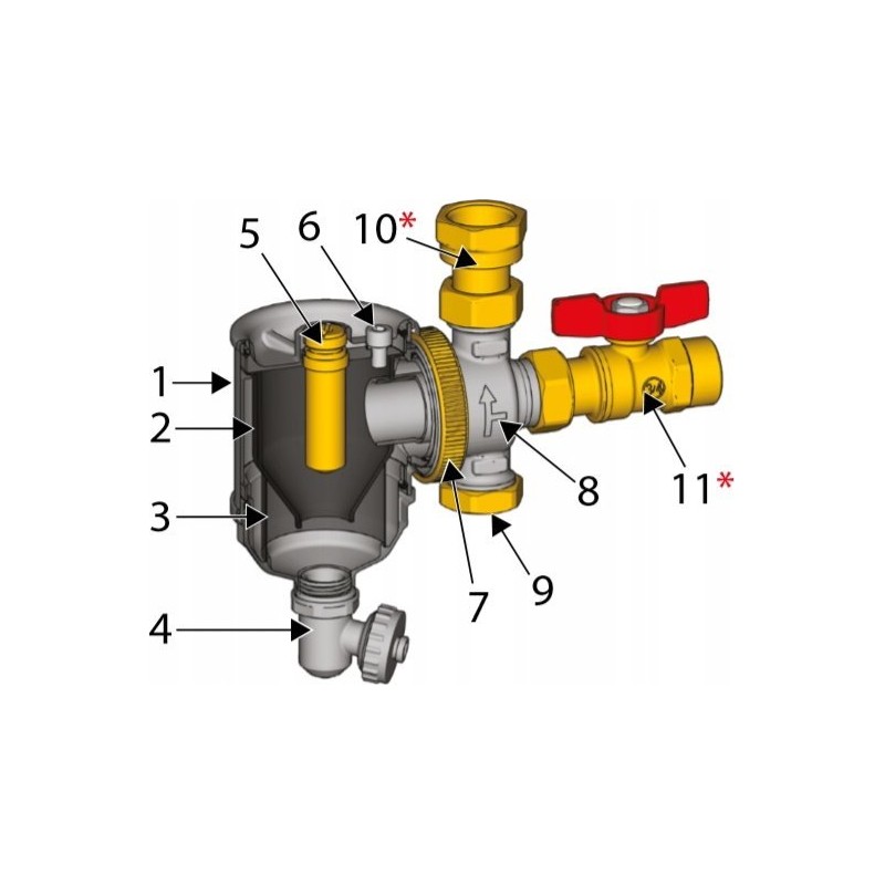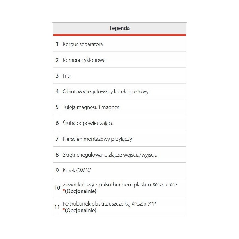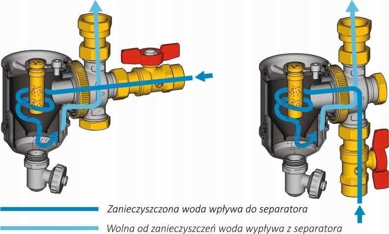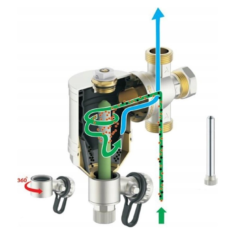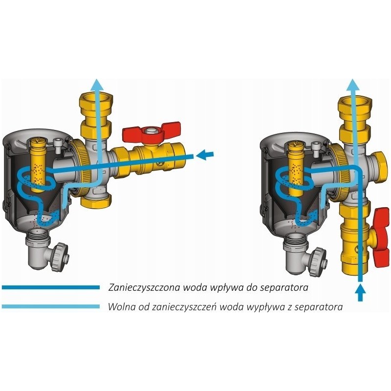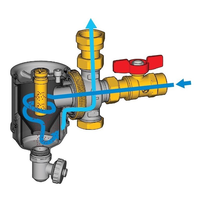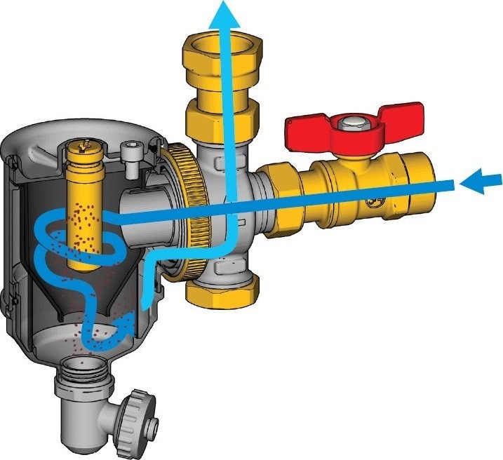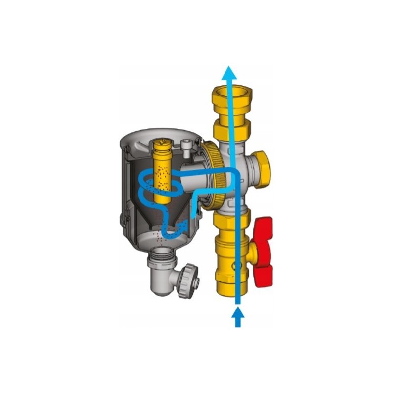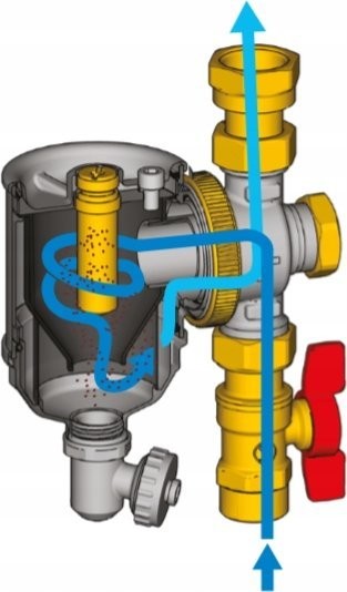 Woda wpływa do sitka filtrującego, a następnie kierowana jest do komory cyklonu gdzie wytworzony ruch wirowy ułatwia oddzielanie cząstek zanieczyszczeń, dodatkowo umiejscowiony w przepływie magnes przechwytuje zanieczyszczenia metaliczne i tlenek żelaza. Filtr siatkowy umiejscowiony w dolnej części cyklonu skutecznie zatrzymuje zanieczyszczenia (300 µm) na dnie komory przesiewacza. Sitko filtrujące posiada w górnej części śrubę służąca do odpowietrzenia komory przy pierwszym uruchomieniu (patrz rozdział “Montaż”)
