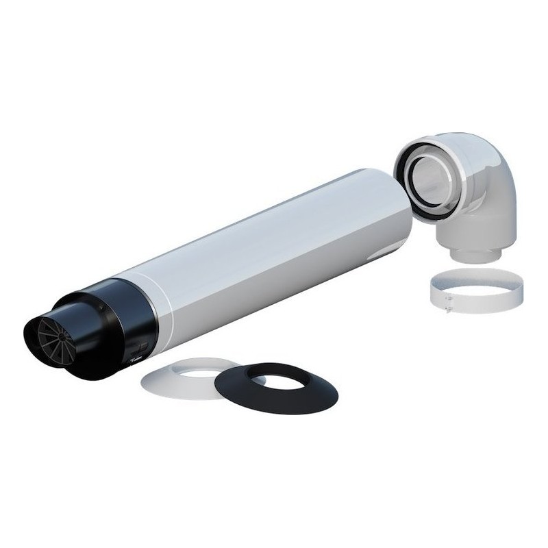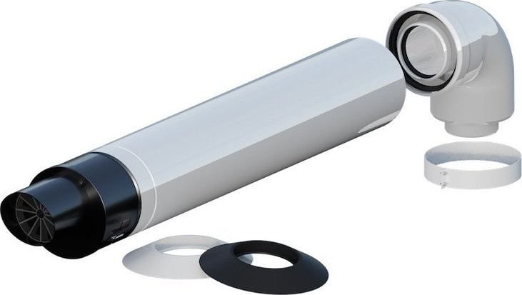 Zestaw zawiera: kolano koncentryczne przycięte 87° DN 60/100, opaska skręcana DN100, wyjście poziome koncentryczne 855mm DN 60/100, dwie rozety DN100,