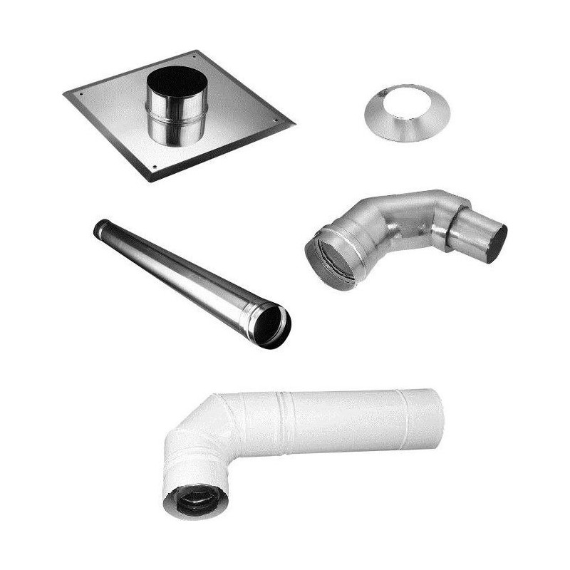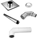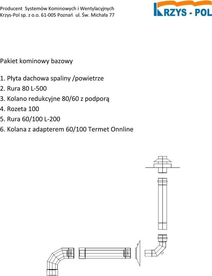 Zestaw zawiera: kolano przyłączeniowe 60/100 w kolorze białym, rurę przyłaczeniową 60/100 L-200, kolano redukcyjne z podporą 60/80, rura 80 L-500, płyta dachowa, rozeta