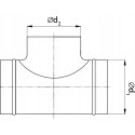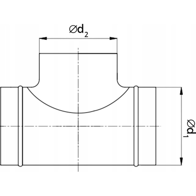 Trójnik rozszerzany z uszczelkami i odejściem (d2) pod kątem 90° o takim samym rozmiarze jaki posiada wlot i wylot (d1), do stosowania we wszelkiego rodzaju systemach dystrybucji powietrza. Solidnie wykonany z blachy ocynkowanej zależnie od rozmiaru ze zgrzewami liniowymi lub nakładką tłoczoną SP nie wymagającymi żadnych dodatkowych uszczelnień.