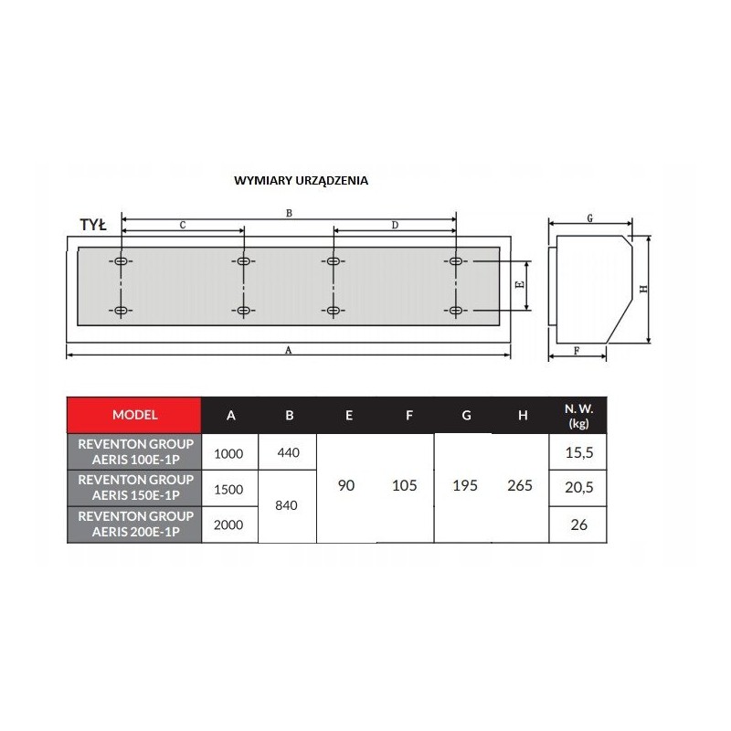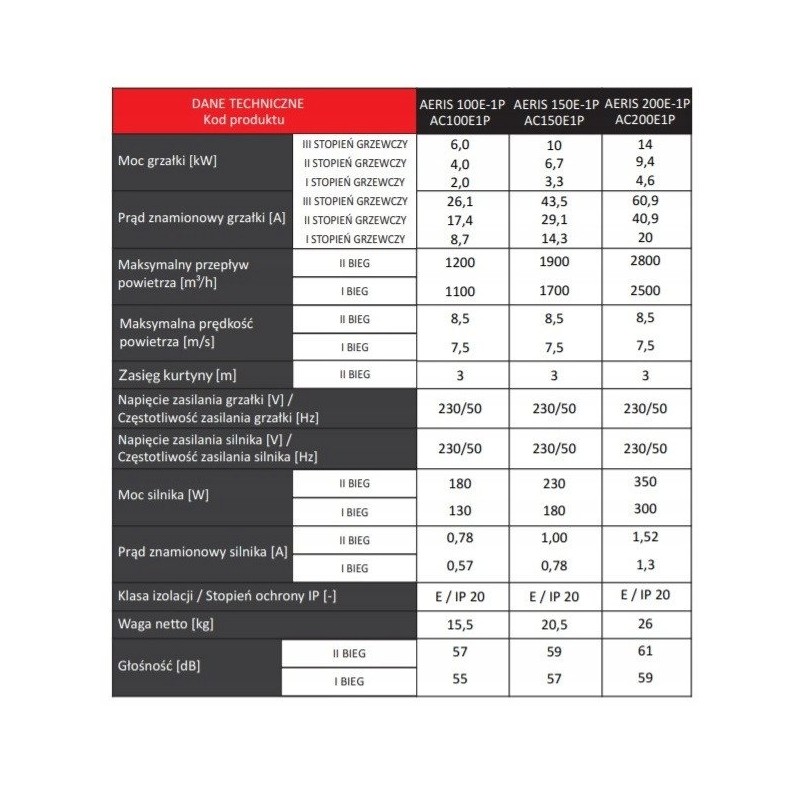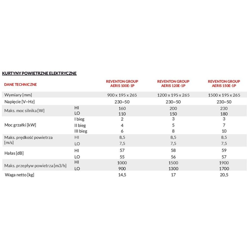 Specyfikacja techniczna kurtyny powietrznej AERIS AC150E-1P