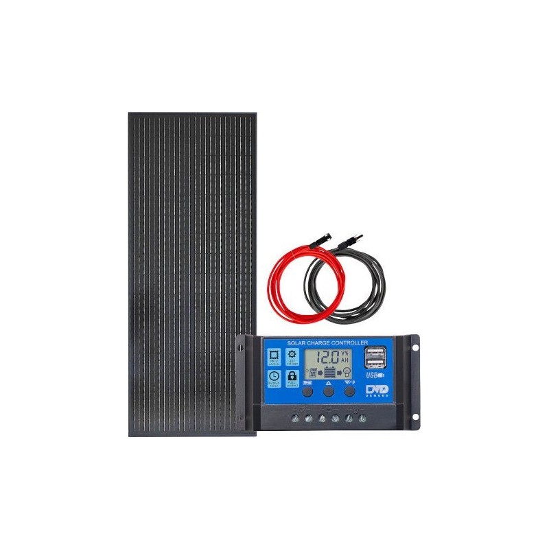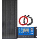 Zestaw solarny Solarfam 100W 12V PWM obejmuje panel słoneczny 100W monokrystaliczny, regulator ładowania PWM 10A oraz zestaw kabli solarnych 2x5m o przekroju 2,5mm² z konektorami. System jest przeznaczony do zasilania urządzeń 12V, co czyni go odpowiednim do zastosowań w kamperach, kampingach i na łodziach.