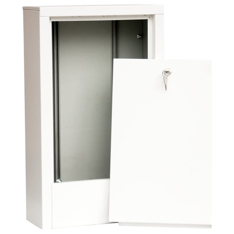 Szafka została wyposażona w zdejmowane frontowe drzwiczki z zamkiem na klucz, co zwiększa bezpieczeństwo przechowywanych elementów. To praktyczne rozwiązanie zapewnia łatwy dostęp do rozdzielaczy, jednocześnie chroniąc je przed niepożądanym dostępem.