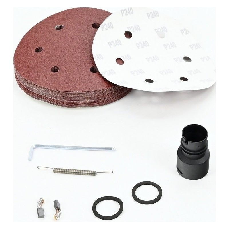 - Bardzo bogaty zestaw akcesoriów, w tym zapasowe szczotki do szlifierki