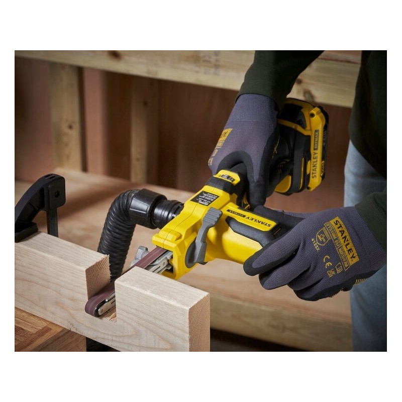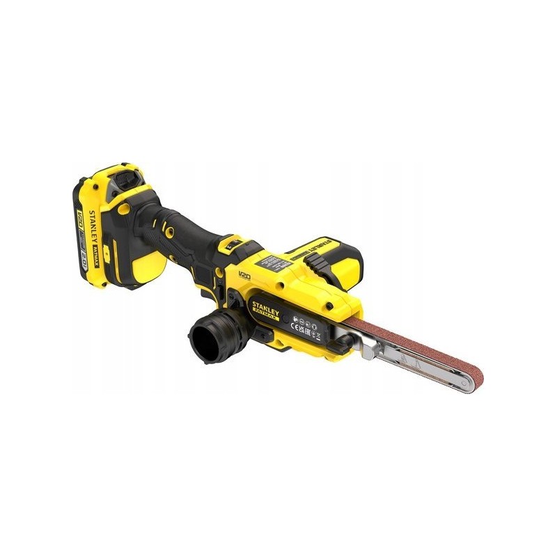 W ZESTAWIE: Dwa akumulatory 18V STANLEY FATMAX V20 2.0Ah, 3 x taśmy szlifierskie (13 mm x 457 mm z powłoką z tlenku glinu i ziarnistością 80/120/240), offsetowe ramię i odłączany port pyłu, ładowarka i walizka.