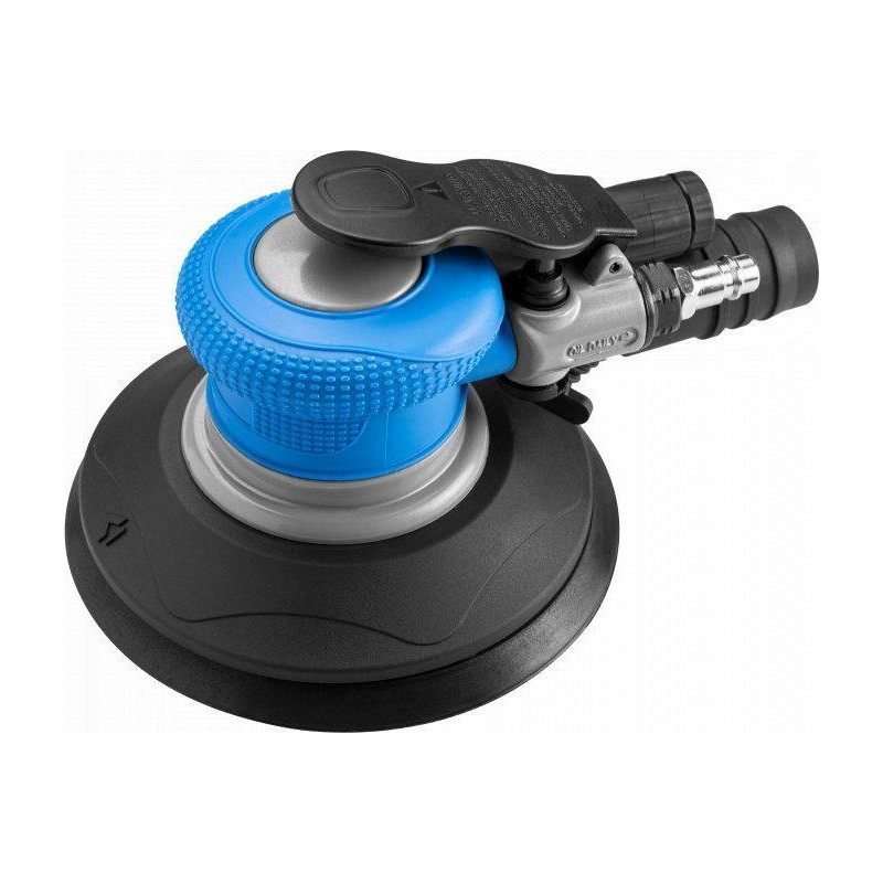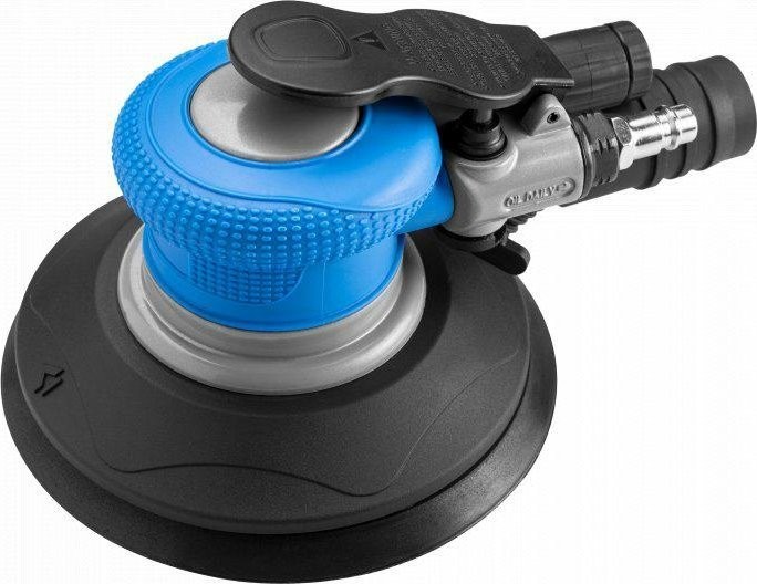 Szlifierka mimośrodowa pneumatyczna z odpylaczem zasilana jest strumieniem sprężonego powietrza pod odpowiednim ciśnieniem. Oscylacja 5 mm zapewnia optymalną obróbkę powierzchni. Tarcza szlifierki jest wyposażona w rzep pozwalający na przyczepienie krążków papieru. W zestawie znajduje się wąż umożliwiajacy podłączenie szlifierki pod odkurzacz oraz specjalny worek na urobek.