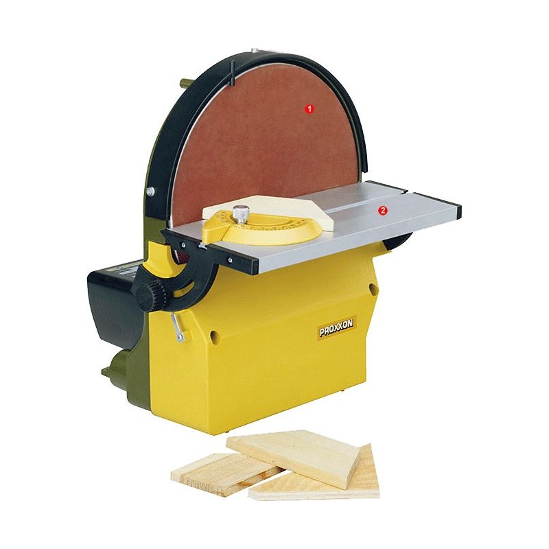 230 V z napędem paskiem zębatym Optibelt (przełożenie 7,3: 1). Elektroniczna regulacja prędkości ok. 250 - 750 m / min. Średnica tarczy 250 mm. Maksymalna wysokość szlifowania 135 mm, stół 275 x 105 mm (nachylenie 15 ° do wewnątrz, 45 ° na zewnątrz). Rozmiar całkowity bez stołu 330 x 280 x 230 mm. Waga 7kg.