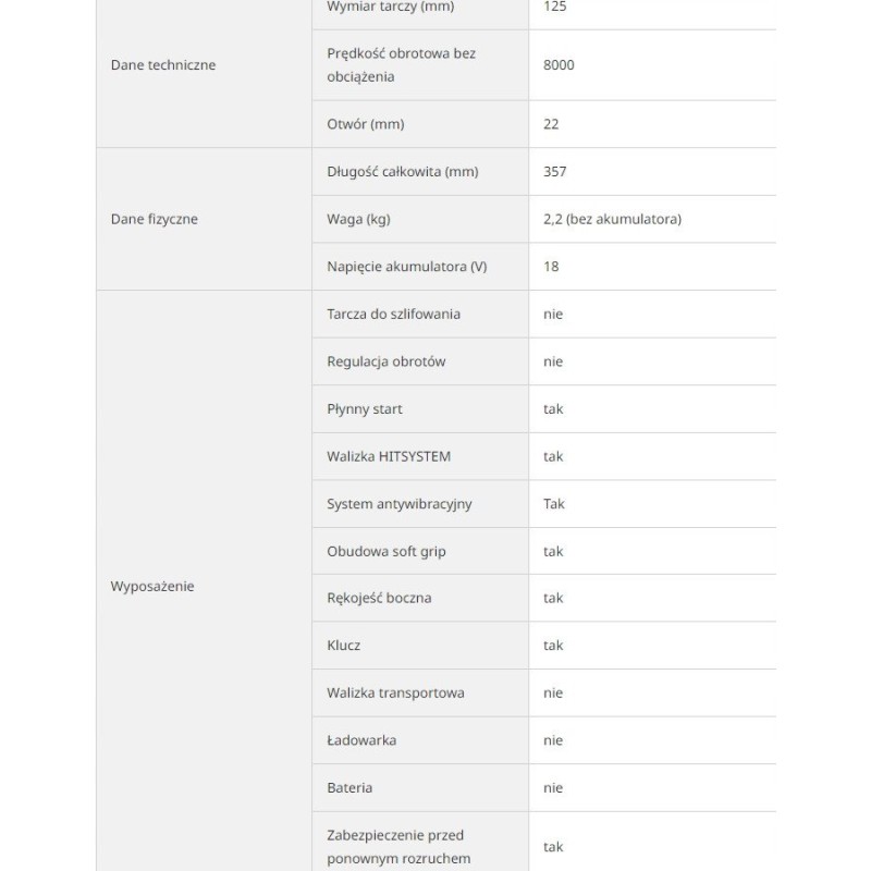 - Wyposażenie podstawowe: rączka boczna antywibracyjna, osłona tarczy, nakrętka i klucz do tarczy, walizka systemowa HITSYSTEM