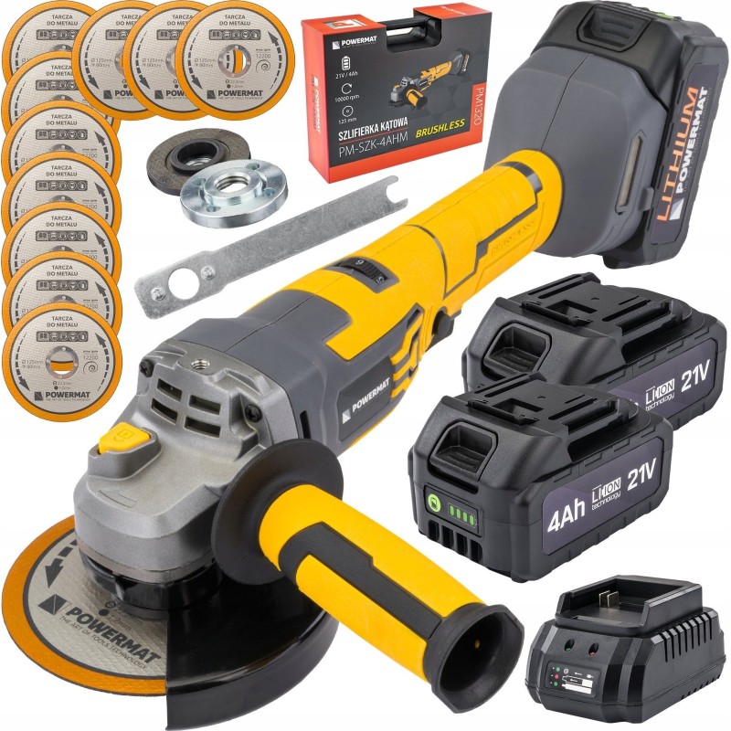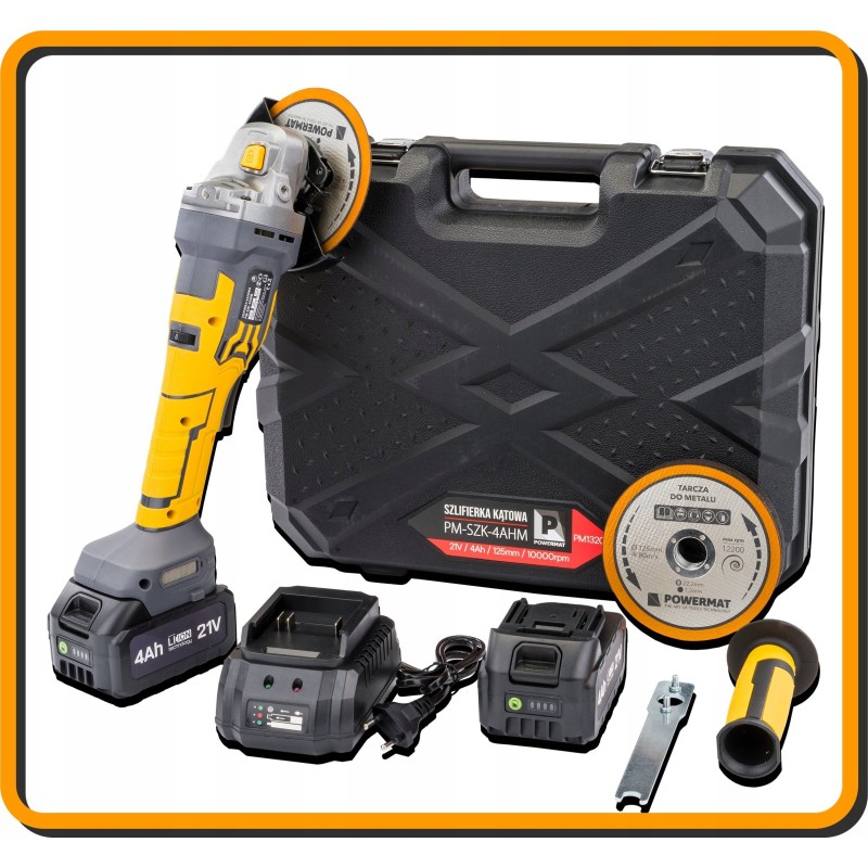 W skład zestawu wchodzi szlifierka kątowa Powermat, 10 sztuk tarcz elektrokorundowych do metalu, klucz do odkręcania tarczy, szybka ładowarka oraz instrukcja obsługi w języku polskim i angielskim. To kompleksowe rozwiązanie, które zaspokoi potrzeby każdego użytkownika.