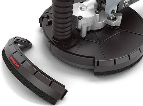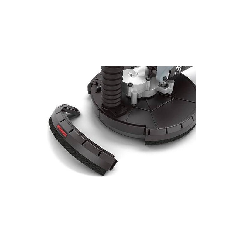 Aby chronić zdrowie użytkownika szlifierki do gładzi, powstający pył musi być szybko i sprawnie odprowadzony z miejsca pracy. Dlatego szlifierka MENZER LHS 225 PRO VARIO posiada talerz napędowy z 6 otworami. Talerz ten dodatkowo otoczony jest elastycznym otokiem szczotkowym, który przy nierównych powierzchniach dba dobre uszczelnienie.