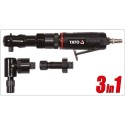 Uniwersalne narzędzie pneumatyczne 3w1 z wymiennymi końcówkami łączy funkcje grzechotki 1/2", szlifierki prostej oraz szlifierki kątowej z trzpieniem 6 mm.