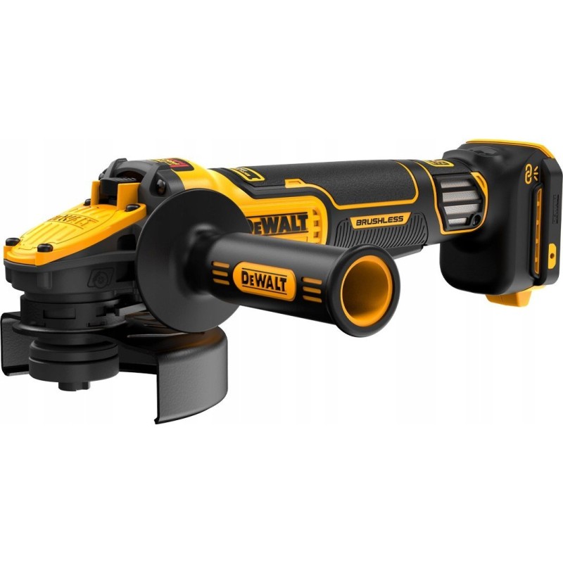 Szlifierka kątowa DeWALT DCG416VS to bezszczotkowe urządzenie o średnicy tarczy 125 mm, wyposażone w elektroniczną regulację obrotów oraz włącznik suwakowy. Urządzenie jest w pełni kompatybilne z akumulatorami serii 18V XR Li-Ion oraz FlexVolt 54V. Oprócz dużej mocy, bezpieczeństwo jest również priorytetem. Mechanizm płynnego startu chroni przed nagłym szarpnięciem i zapewnia większe bezpieczeństwo pracy. Wymiana tarcz odbywa się bez użycia narzędzi, a osłona tarczy jest łatwo regulowana. Działa z systemem Power-OFF, który chroni silnik i moduł przed przeciążeniami. Technologia Perform and Protect zapewnia bezpieczeństwo użytkowania - elektroniczne hamulce i sprzęgło niwelują ryzyko odrzutu i wyrwania urządzenia z ręki. Szlifierka kątowa ma również miejsce na montaż Chip TOOL CONNECT™, który ułatwia śledzenie narzędzi.