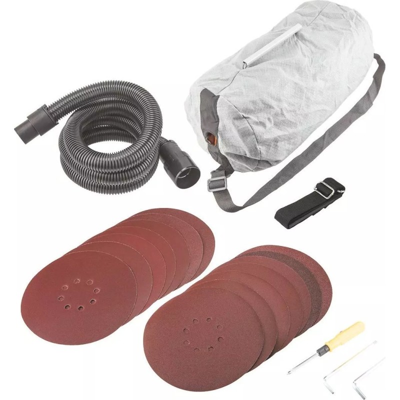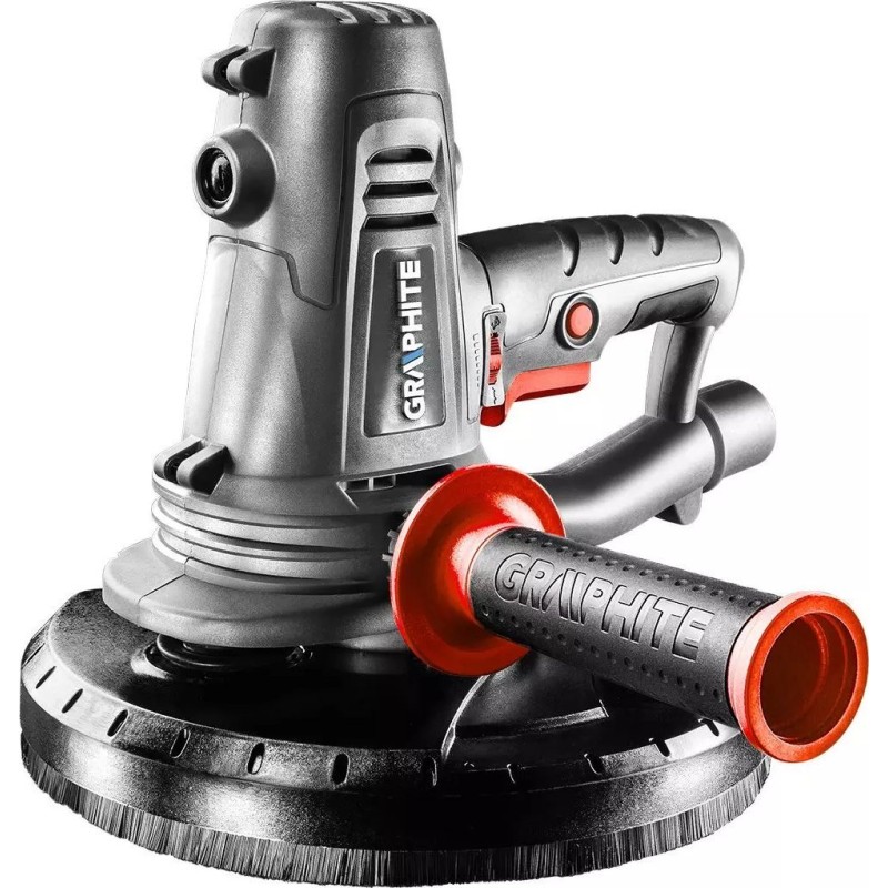 Wysokiej klasy szlifierka do gipsu GRAPHITE (nr ref. 59G262) o mocy 1050 W, przeznaczona do precyzyjnej obróbki powierzchni gipsowych. Szlifierka wyposażona jest w bezpośredni napęd tarczy szlifierskiej - z pominięciem wałka. Posiada możliwość płynnej regulacji obrotowej głowicy w zakresie od 800 do 2300 obrotów na minutę. Tarcza szlifierki o średnicy 225 mm. System odprowadzania pyłu z możliwością bezpośredniego podłączenia worka na pył lub rury odkurzacza zapewni porządek w miejscu pracy. Ponadto szlifierka została wyposażona w dodatkowy uchwyt obustronny. Na rękojeści głównej znajdują się gumowe nakładki ochronne, zapewniające komfort i stabilność podczas szlifowania. Dla bezpieczeństwa tarcza robocza została osłonięta szczotkową osłoną. Wymiana zużytego papieru ściernego odbywa się błyskawicznie, gdyż mocowany jest on na rzep. Szlifierka do gipsu posiada długi przewód zasilający o długości 5 m. Istnieje możliwość samodzielnej wymiany zużytych szczotek węglowych. W zestawie ze szlifierką znajdują się: papier ścierny (2x P80, 2x P120, 2x P150, 4x P180, 4x P240), wąż ssący, pas naramienny i worek na pył. Zgodność z europejskimi standardami zapewnia certyfikat CE.