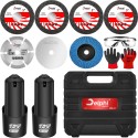 - Dodatkowe informacje: akumulator w zestawie, antypoślizgowy uchwyt, łagodny rozruch, możliwość pracy na mokro, możliwość pracy na sucho, osłona tarczy, torba transportowa w zestawie, walizka transportowa w zestawie, wymienne akcesoria w zestawie, wymienne tarcze w zestawie