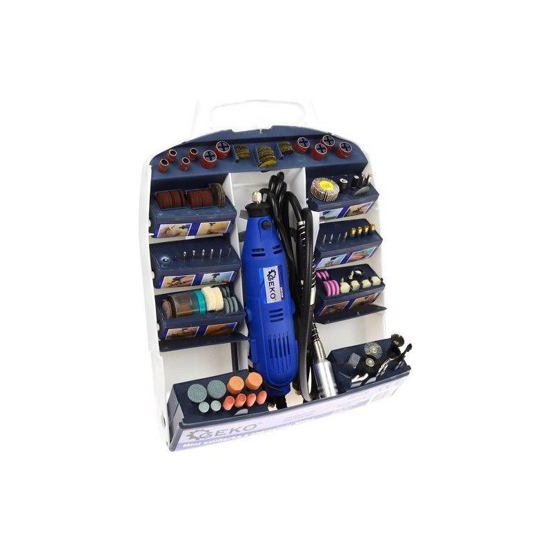 Multiszlifierka z pełnym zestawem akesoriów 300 elementów. Dzięki dużej ilości różnorodnych końcówek, mini szlifierka doskonale sprawdzi się podczas prac modelarskich, drobnych naprawach, podczas czyszczenie i polerowanie drobnych elementów, takich jak np. biżuteria. Urządzenie wyposażone zostało w silnik o mocy 270W z możliwością płynnej regulacji obrotów w zakresie 8000-32500 obr/min. Dodatkowo szlifierka wyposażona została w elastyczny wałek z uchwytem do końcówek, który umożliwia bardzo precyzyjna prace, nie obciążając ręki wagą urządzenia.