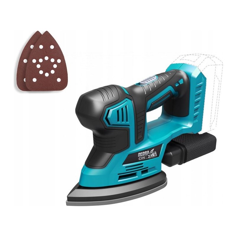 Akumulatorowa szlifierka delta DED7063 Dedra należy do linii narzędzi akumulatorowych SAS+ALL zasilanych tym samym akumulatorem litowo-jonowym 18V. Szlifierka posiada stopę deltę, zwaną też żelazkiem, dzięki czemu sprawdzi się przy szlifowaniu narożników i trudno dostępnych miejsc. Narzędzie wyposażono w materiałowy worek, do którego trafia pył, dzięki czemu urobek powstały podczas szlifowania nie rozprzestrzenia się nadmiernie i nie osadza się na stopie szlifierskiej. Ponadto model DED7063 posiada ogumowaną rękojeść, która zapewnia wygodną obsługę.