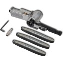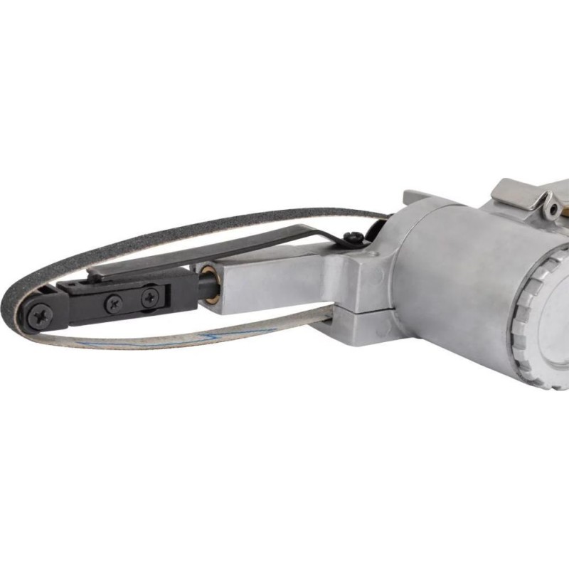 Ta szlifierka pneumatyczna jest dostarczana wraz z 3 taśmami szlifierskimi (ziarnistość 60, 80 i 120), które mogą być szybko zmieniane bez dodatkowych narzędzi oraz są automatycznie napinane siłą sprężyny, co zapewnia ich poprawne prowadzenie.
