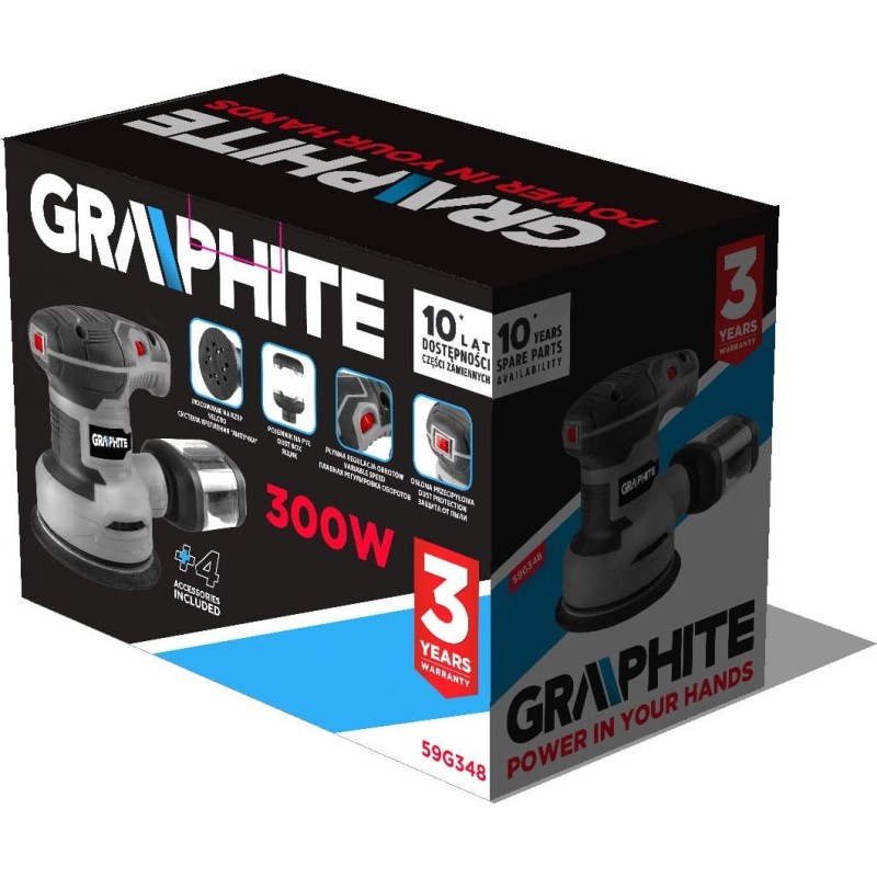 Antypoślizgowa rękojeść oraz niska masa narzędzia umożliwiają wygodną pracę jedną ręką. Szlifierka oferuje ustawienie prędkości w zakresie od 1 do 6. Urządzenie marki GRAPHITE to sprawdzone narzędzie na lata.