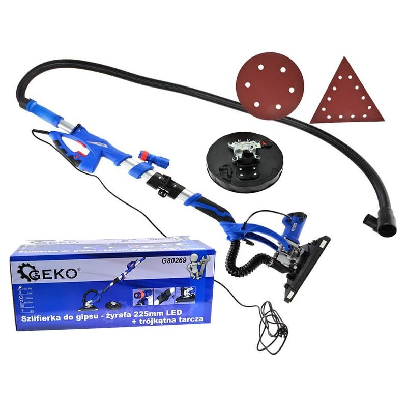 Szlifierka do gipsu GEKO jest niezbędnym narzędziem przy montażu płyt kartonowo-gipsowych. Stosuje się ją do wygładzania masy tynkarskiej stosowanej podczas montażu płyt kartonowo-gipsowych. Innowacyjna, składana konstrukcja umożliwia bezproblemowe transportowanie maszyny i akcesoriów. Zdejmowany segment szczotek umożliwia szlifowanie aż do krawędzi.CECHY SZLIFIERKI DO GIPSU - Moc 710W- Ruchoma głowica- Zmienna prędkość od 800 do 1700 obr./min- Regulowana siła ssania- Włącznik / wyłącznik oświetlenia LED- Wysięgnik teleskopowy, regulacja długości urządzenia w zakresie od 1350 do 1600 mmAKCESORIA DOŁĄCZONE DO SZLIFIERKI TYPU ŻYRAFA - 1x wąż ssący o długości 2m- 2x podkładka metalowa- 1x para szczotek węglowych- 1x klucz imbusowy- 2x adapter do węża o średnicach 37 & 53 mm- 2 paczki 6 sztuk papieru ściernego okrągłego: #60, #80, #120, #150, #180, #240 każdy po 1 sztuce- 2 paczki 6 sztuk papieru ściernego trójkątnego: #60, #80, #120, #150, #180, #240 każdy po 1 sztuce- 1x torba przenośnaDANE TECHNICZNE GEKO G80269 Moc: 710W Napięcie zasilania: 230V / 50HzŚrednica dysku: 225mmŚrednica tarczy szlifierskiej: 215 mmŚrednica wyciągu pyłu: 32 mmDługość węża: 2 mDługość kabla: 4 m