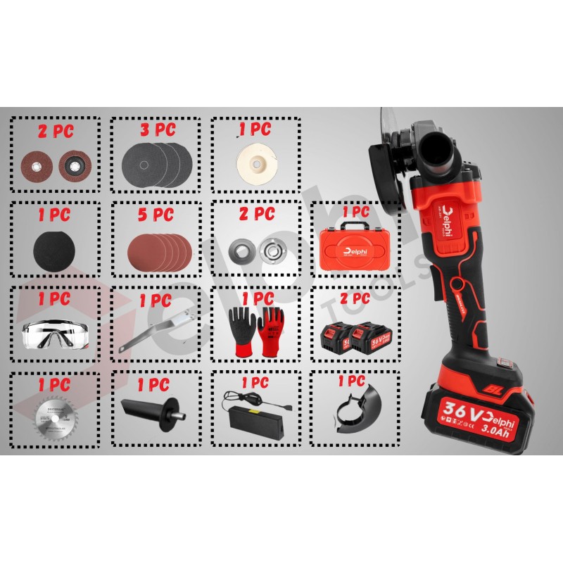 Szlifierka Delphi Tools SZLIFIERKA KĄTOWA AKUMULATOROWA BEZSZCZOTKOWA GUMÓWKA KĄTÓWKA 2x AKU