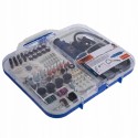 Zestaw zawiera różnorodne tarcze i dyski, w tym dyski diamentowe, tarcze szlifierskie oraz szczotki stalowe. Taka różnorodność sprawia, że narzędzie jest idealne do szlifowania, cięcia oraz polerowania różnych materiałów.