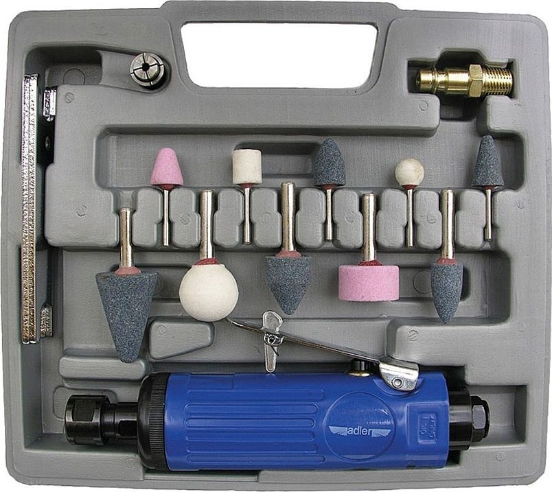 - Zestaw składa się z szlifierki trzpieniowej AD-145, 10 kamieni szlifierskich w różnych kształtach i gradacjach,