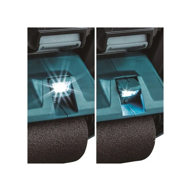 Podwójne diody LED w szlifierce MAKITA BS001GZ oświetlają obszar roboczy, co pozwala na precyzyjne szlifowanie nawet w słabo oświetlonych miejscach. Kąt ich ustawienia można dostosować w zakresie od 15° do 30°, co zwiększa funkcjonalność narzędzia.