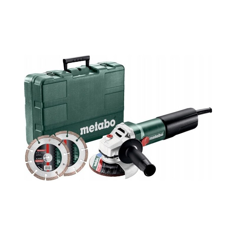 Sieciowa szlifierka kątowa WQ 1100-125 SET Metabo 610035510 jest bogatą kompletacją uniwersalnej kątówki z dwoma diamentówkami do cięcia materiałów budowlanych i walizki transportowej. Szlifierka o mocy 1100W sprosta większości prac związanych ze szlifowaniem metali, drewna, ceramiki i betonów. Silnik o dużej odporności na przeciążenia i wloty powietrza umiejscowione w szczycie korpusu pozwalają na intensywne cięcie betonów, dachówek i ceramiki. Osprzęt wymieniany jest beznarzędziowo w systemie Metabo Quick, polegającym na luzowaniu nakrętki SDS poprzez wciśnięcie blokady wrzeciona na małych obrotach. O bezpieczeństwo użytkownika dba najszybsze zabezpieczenie przed skutkami zakleszczenia się tarczy – Metabo S-automatic. Mechaniczne sprzęgło rozłącza napęd z osprzętem, gwarantując zminimalizowanie odrzutu i szybki powrót do pracy. Antyrestart chroni operatora przed samoistnym uruchomieniem się silnika po powrocie zasilania do maszyny ze wciśniętym włącznikiem. Osłona tarczy posiada specjalne wypustki, uniemożliwiające jej przesuniecie bez ingerencji użytkownika. Gumówka Metabo klasy economy łączy sprawdzone technologie niemieckiego producenta elektronarzędzi i przystępną cenę sprzętów z niższej półki.