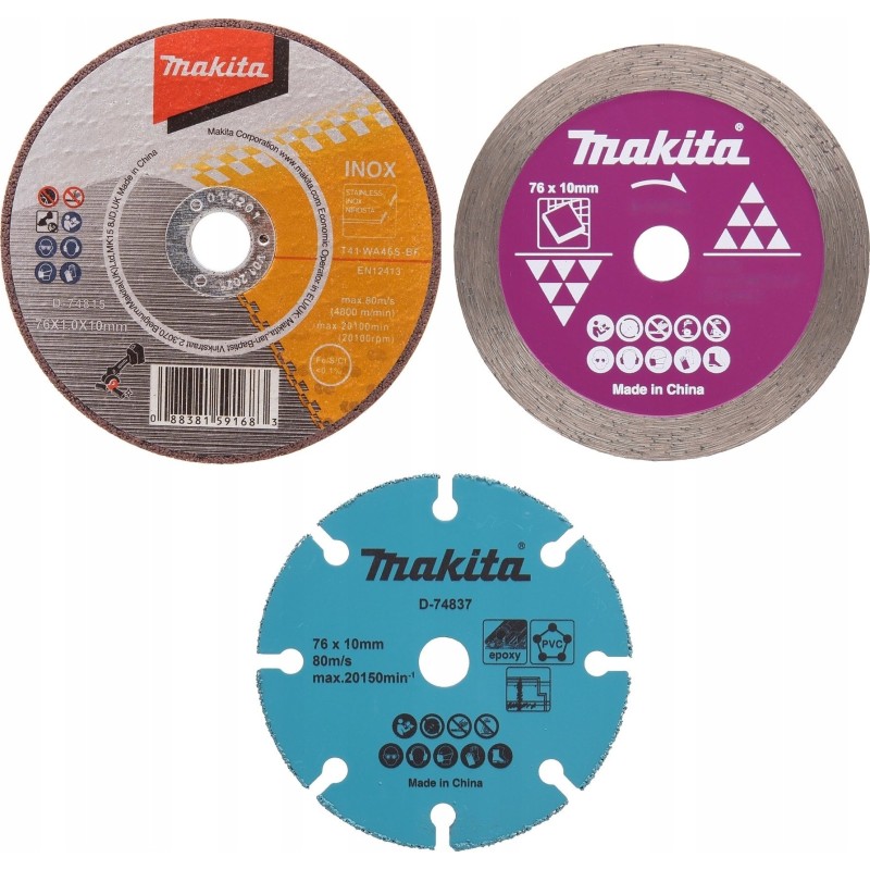 W zestawie z szlifierką znajduje się szereg tarcz, które umożliwiają cięcie różnych materiałów. Użytkownicy otrzymują: