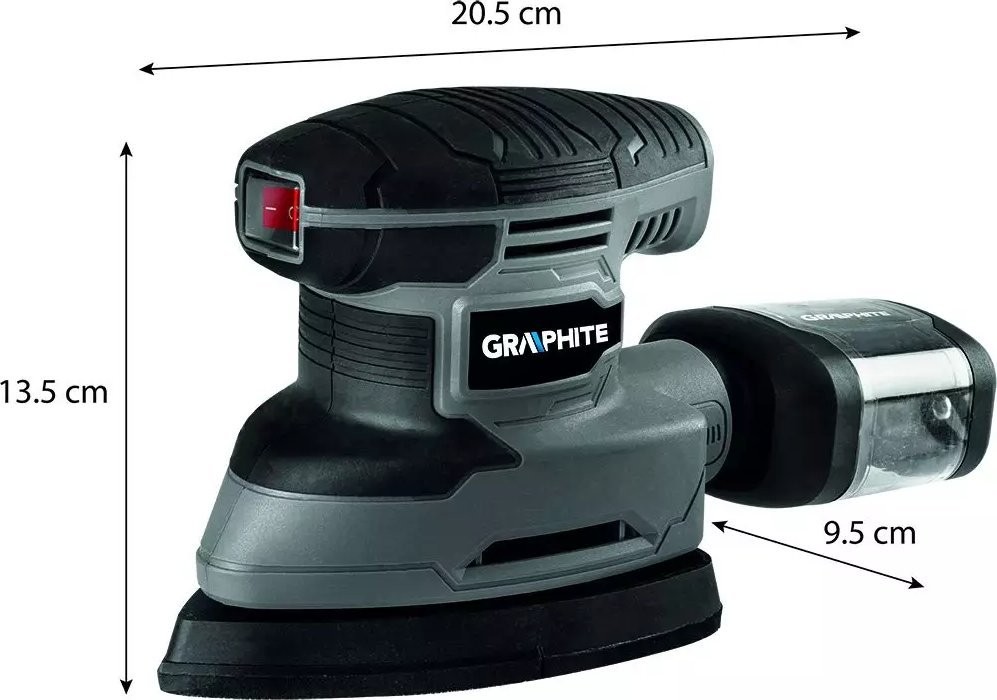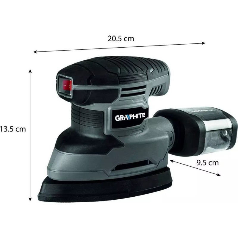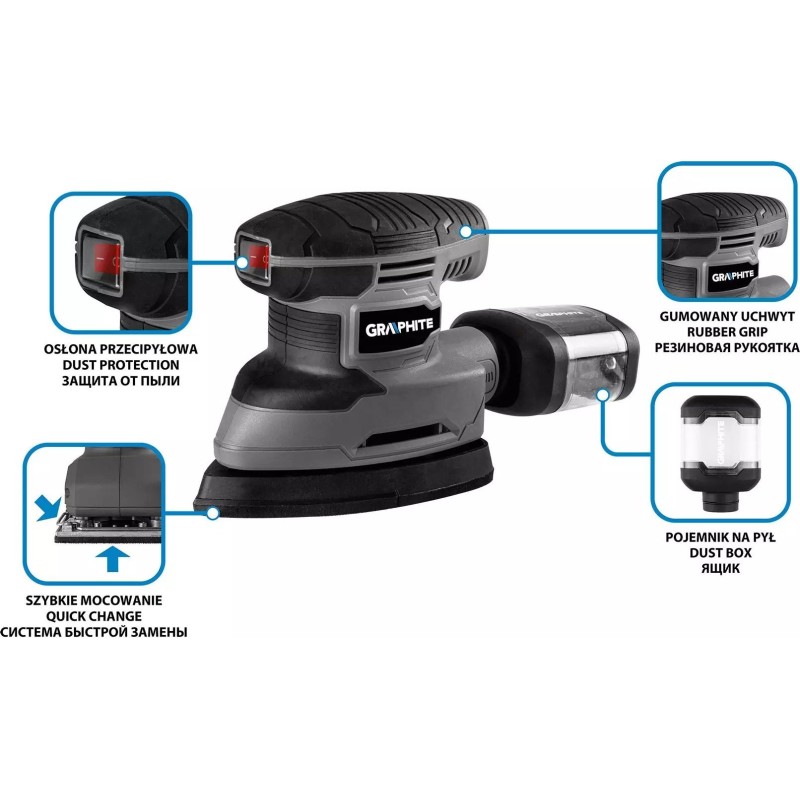 Szlifierka posiada wymienne stopy. Jej amplituda oscylacji wynosi 0,8 mm. Ergonomiczny kształt oraz antypoślizgowa rękojeść wpływają na komfort pracy tym narzędziem. Szlifierka pozwala na sprawne wykonywanie zadań jedną ręką. Dzięki systemowi odprowadzania pyłu, umożliwia zachowanie czystości na stanowisku pracy. To nowoczesne narzędzie marki GRAPHITE, które sprawdzi się w każdym warsztacie. Oferowane w zestawie z 3 stopami, papierem ściernym (9 sztuk) oraz króćcem przyłączeniowym.