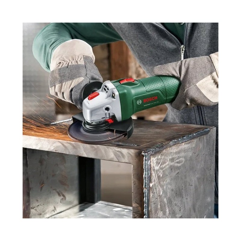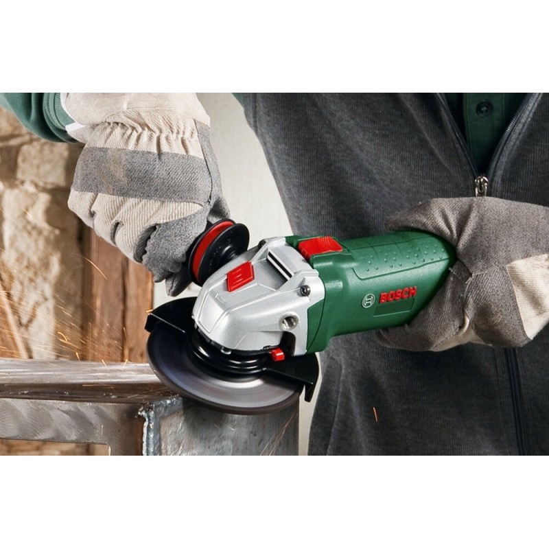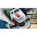 Ergonomiczna rączka szlifierki BOSCH 750-115 ma powłokę typu SoftGrip, która ułatwia pewne chwycenie narzędzia i zapewnia precyzyjną pracę. Atutem jest dodatkowa rękojeść boczna, która zapewnia optymalne prowadzenie narzędzia i, w razie potrzeby, pozwala na większą siłę nacisku na obrabiany materiał. Rękojeść pomocnicza sprawia, że praca jest również bardziej wygodna, co przekłada się na osiągnięcie większej precyzji podczas obróbki materiału.