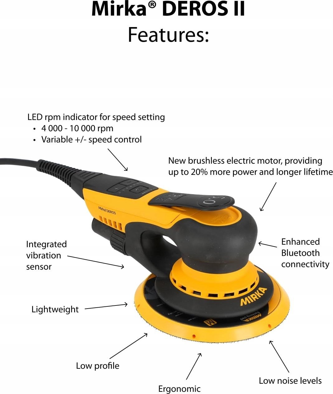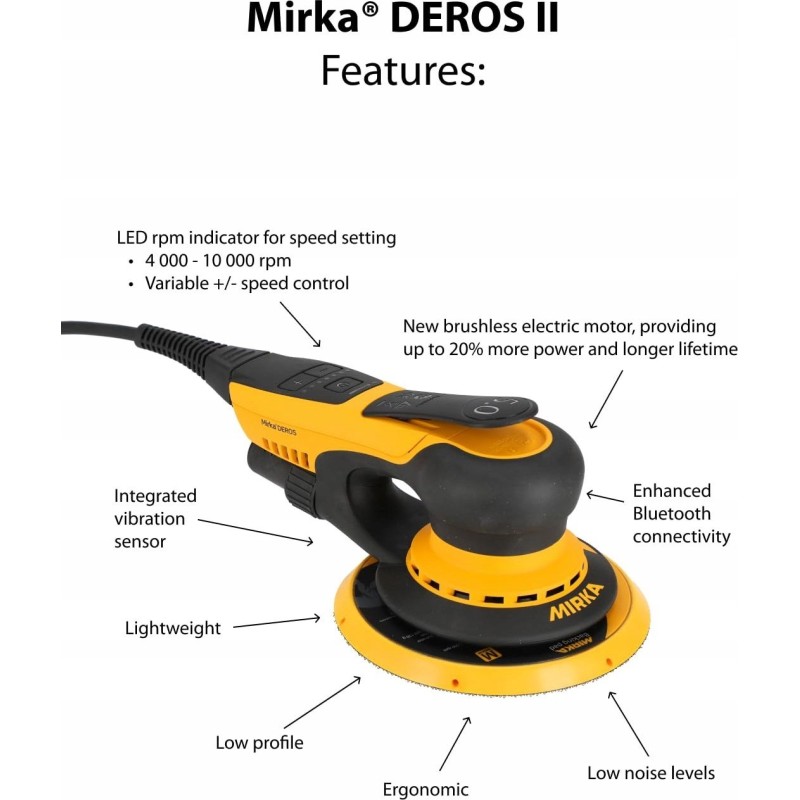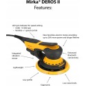 - Najważniejsze cechy techniczne DEROS II 5650: Ø 125 mm i Ø 150 mm talerze szlifierskie, skok 5,0 mm, niski poziom wibracji i cicha praca, wydajny silnik elektryczny, waga zaledwie 1 kg, płaski kształt (tylko 10 cm wysokości), nowoczesny silnik bezszczotkowy, regulator prędkości, wskaźnik prędkości obrotowej LED, zintegrowany czujnik wibracji i połączenie Bluetooth z aplikacją myMirka