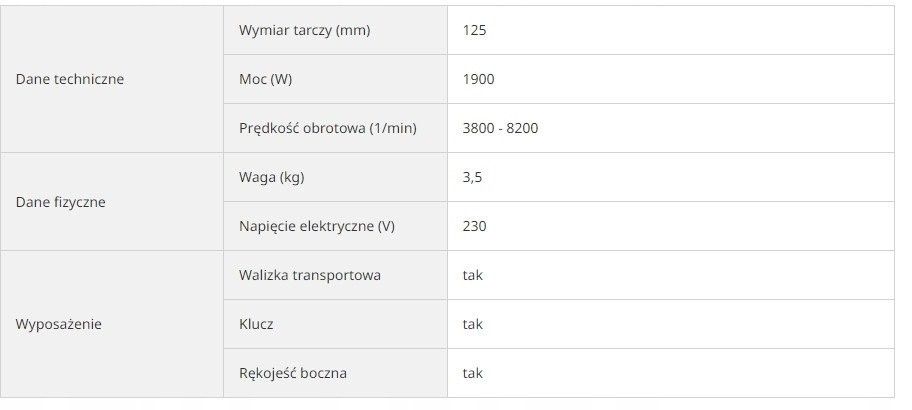 W skład zestawu wchodzi nie tylko szlifierka GM13Y, ale także tarcza garnkowa, klucz oraz praktyczna walizka do przechowywania. Dzięki temu masz wszystko, co potrzebne do rozpoczęcia pracy, w jednym miejscu.