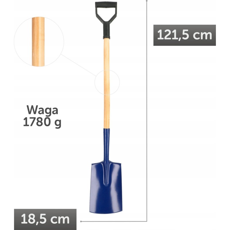 Długość narzędzia to 121,5 cm, szerokość głowicy to 18,5 cm. Dostępne dwie wersje: z ostrym i prostym zakończeniem.