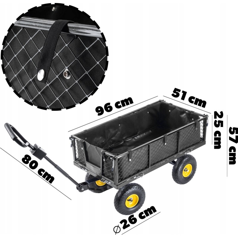 Postaw na wygodę i zapomnij o odciskach dłoni i bólu pleców podczas transportu ciężkich materiałów! Wymiary wózka - 96 x 51 x 25 cm, ładowność do 300 kg oraz estetyczne wykonanie umożliwiają sprawniejsze i bardziej komfortowe wykonywanie obowiązków przydomowych, w ogrodzie czy w miejscu pracy.