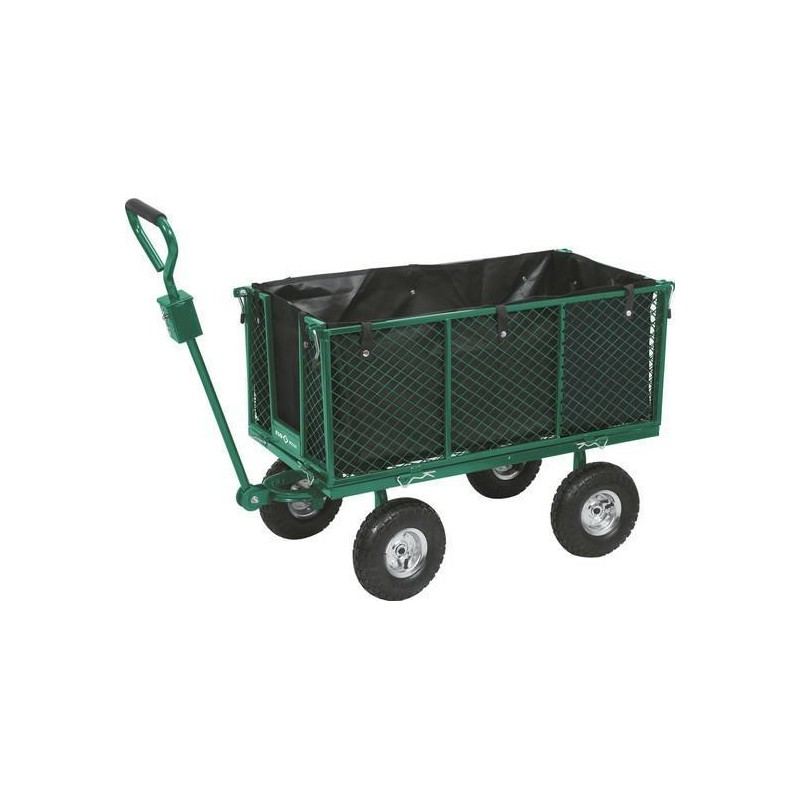 Wózek posiada 4 pompowane koła, kosz o stalowej konstrukcji i uchwyt do ciągnięcia. Dodatkowo w zestawie odpinana, wytrzymała plandeka PVC. Wszystkie burty
