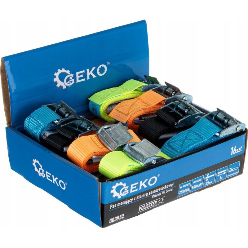 Pas mocujący z klamrą samozaciskową o wymiarach 25mm x 1m to doskonałe rozwiązanie do transportu oraz zabezpieczania różnorodnych ładunków. Z maksymalnym obciążeniem wynoszącym 500 kg, oferuje solidne wsparcie, które jest kluczowe w wielu sytuacjach. Wyprodukowany przez uznaną firmę Geko, ten pas zapewnia wysoką jakość i niezawodność, co czyni go świetnym wyborem dla każdego, kto stawia na bezpieczeństwo i efektywność.