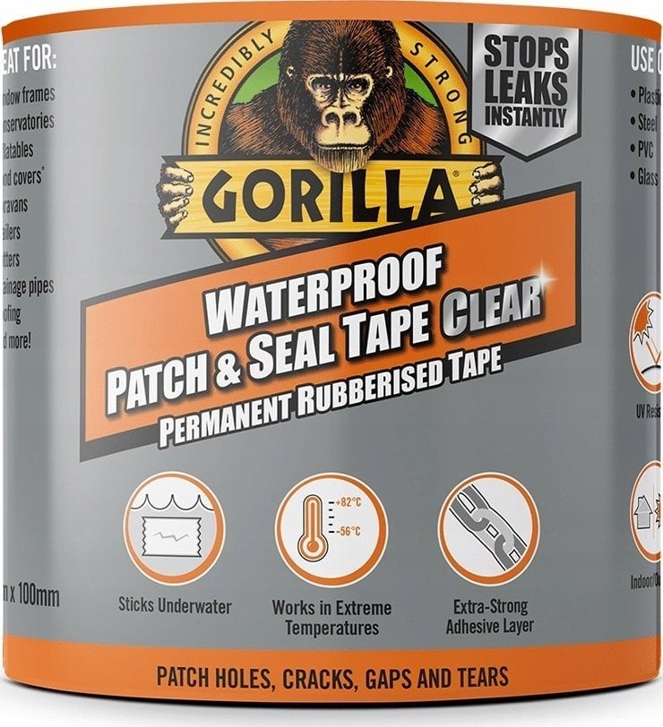 Taśma Gorilla Waterproof Patch & Seal White natychmiast zabezpiecza przed wodą, powietrzem i wilgocią. Dzięki wyjątkowo grubemu klejowi i odpornemu na promieniowanie UV podłożu, ta taśma tworzy trwałe połączenie zarówno wewnątrz, jak i na zewnątrz. Przy szerokości 4 cali, doskonale nadaje się do naprawy dziur, pęknięć, szczelin i rozdarcie, nawet pod wodą. Idealna do stosowania w domu, na basenie, w namiocie, na dachu, rurach, samochodach, łodziach, kempingach, przyczepach kempingowych, na zewnątrz i w wielu innych miejscach!