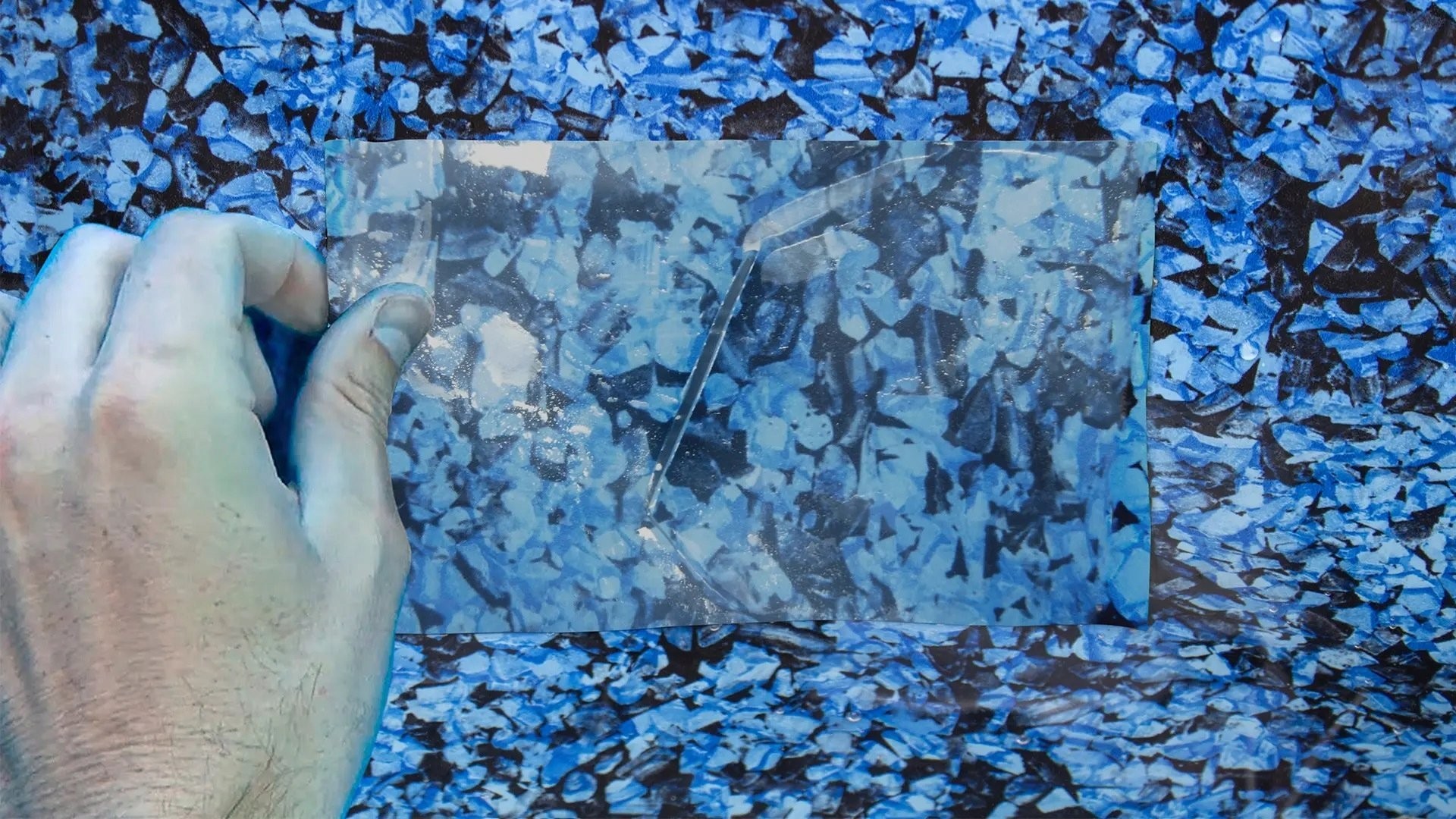 1. Trzymając folię pomocniczą, przyciąć taśmę do odpowiedniego rozmiaru. Taśma powinna być większa niż obszar naprawy, wystawać poza jego krawędzie. Nakładanie taśmy na siebie może spowodować przecieki. Zaokrąglij rogi łatki, aby zmniejszyć ryzyko podnoszenia się taśmy. Jeśli to możliwe, przyklej taśmę z obu stron naprawy.