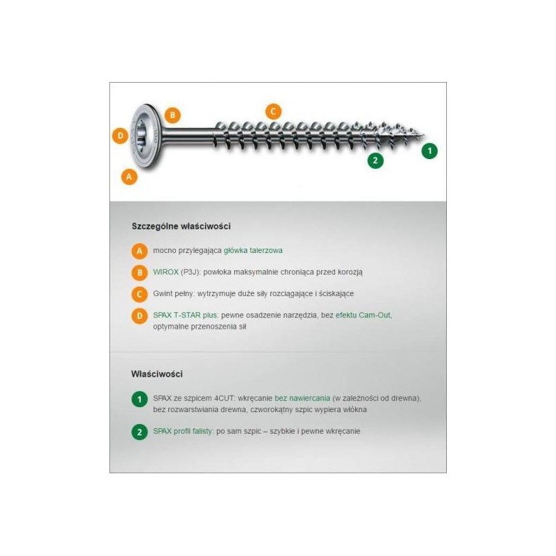 - Wkręty SPAX z 4CUT: wkręcanie bez przedwiercania (w zależności od rodzaju drewna), brak rozszczepienia drewna, czworokątny szpic wypiera włókna