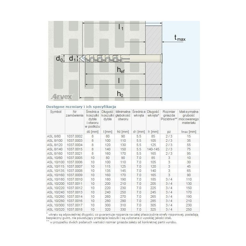 Arvex DYBEL RAMOWY ŁEB Z NACIĘCIEM KRZYŻOWYM ASL 10/320MM