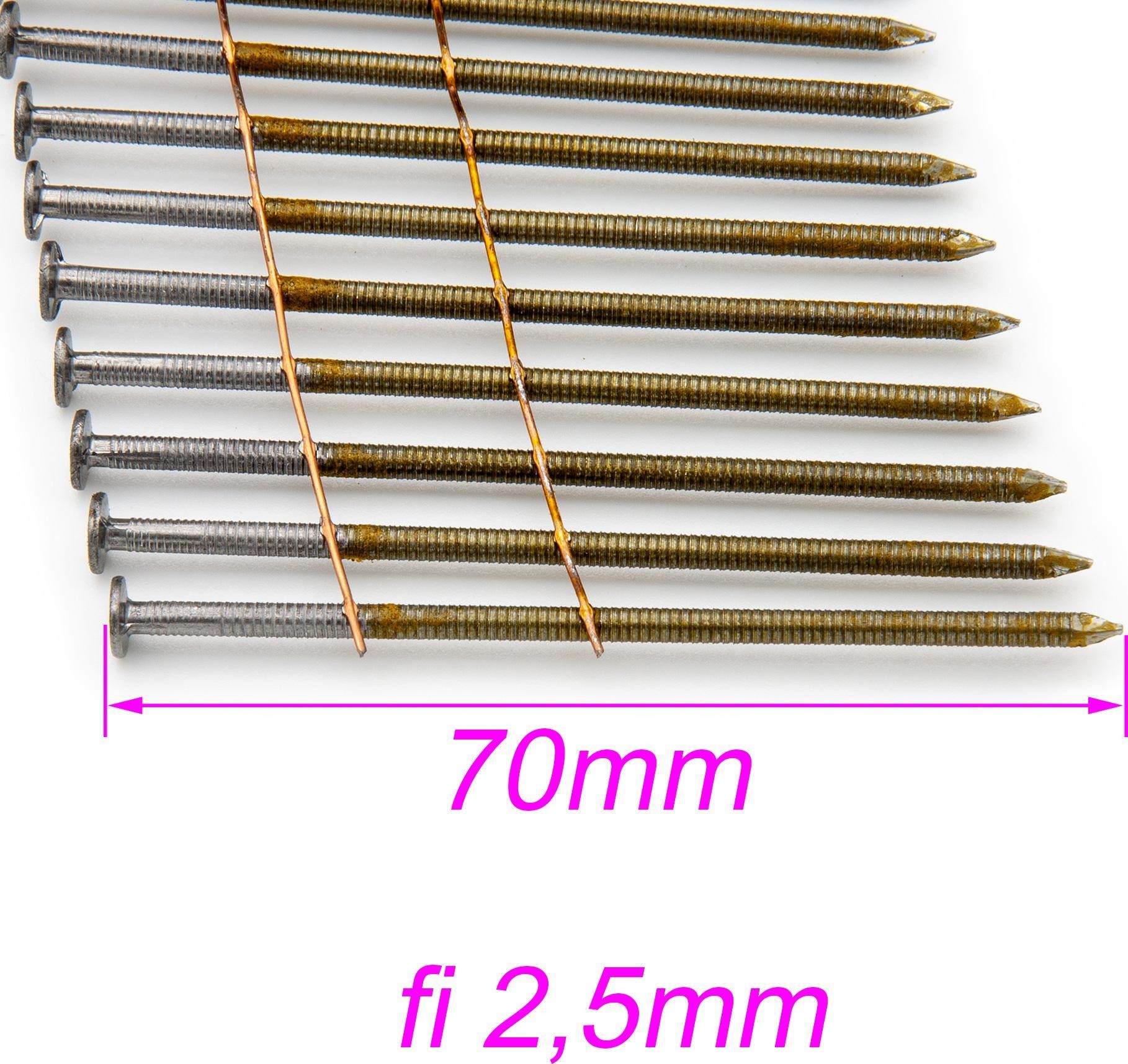 - wymiary: grubość 2.5 mm, długość 70 mm, gwoździe mocowane do drutu pod kątem 16°
