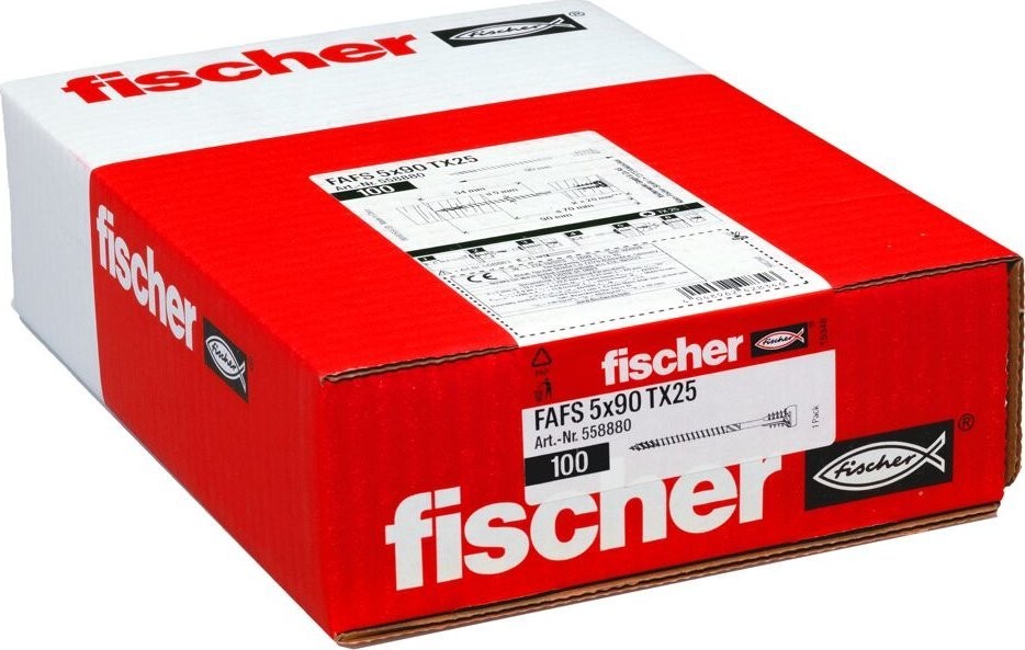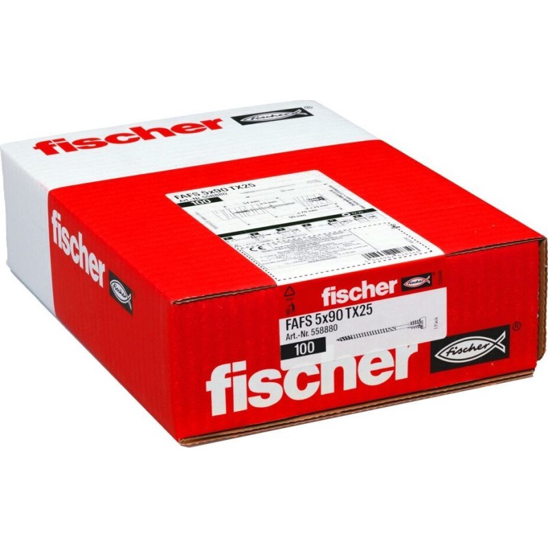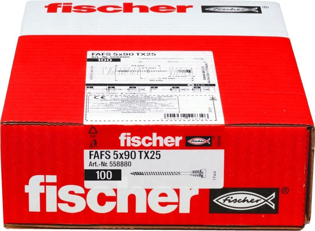 Fischer 558880. Model: Śruba, Materiały: Metal, Odpowiednie do materiałów: Drewno. Długość produktu: 90 mm, Długość gwintu: 5,4 cm, Przekątna nici: 5 mm. Ilość na paczkę: 100 szt.