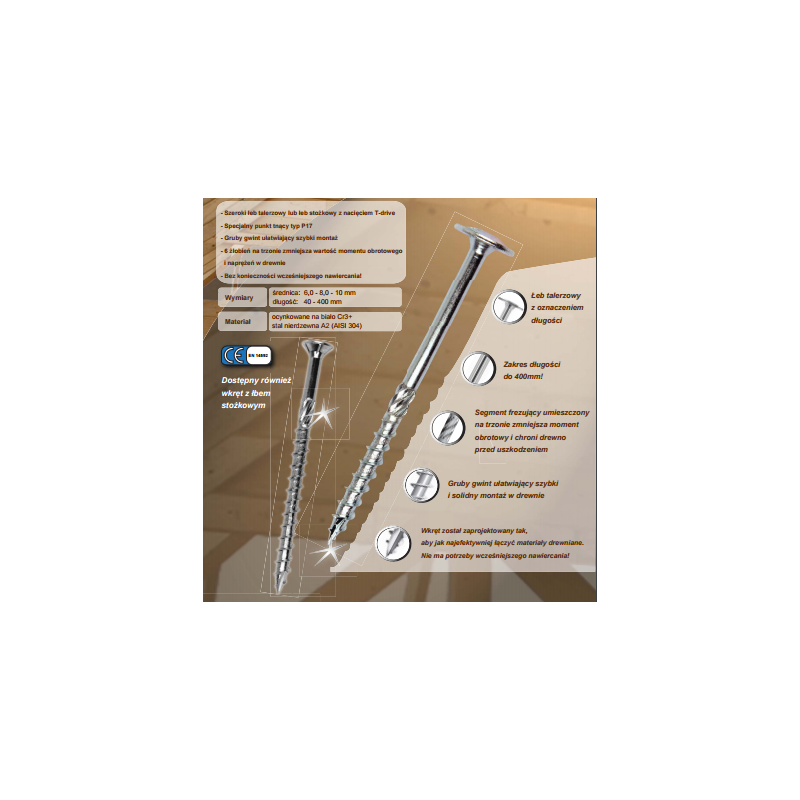 Wkręt do drewna z kołnierzem na torx ocynkowany 8x180mm T40 - PETTGK080180Z